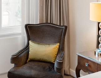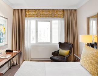 Rommene er moderne innredet og utstyrt med en behagelig lenestol og skrivebord, ideelt for både avkobling og arbeid. Opplev den unike atmosfæren og tidløse elegansen som kjennetegner Hotel Continental.